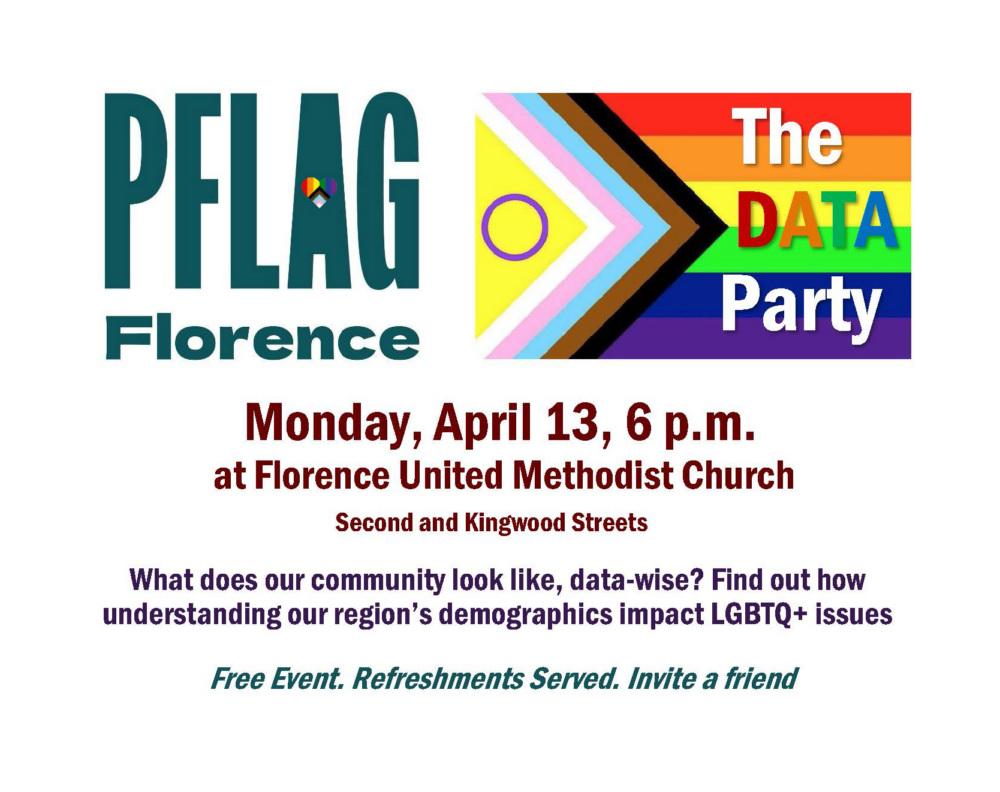 Next meeting is April 13 at 6 p.m. Data Party to review Western Lane County demographics as they relate to the LGBTQ+ community, their families and friends. Hope to see you there!